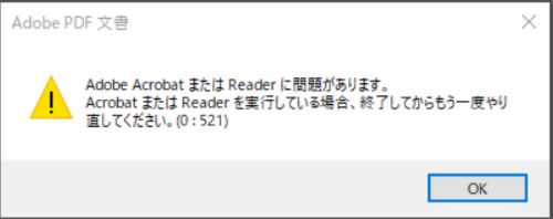 エラーメッセージ Adobe Acrobat または Readerに問題があります。 Acrobat または Reader を実行している場合終了して絡もう一度やり直してください。(0:521) 現象 ブラウザ内にPDFを表示させるようなシステム(Webアプリ等)で、PDF表示時に発生しうるエラ…